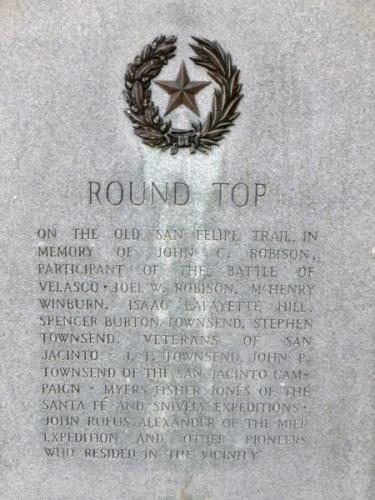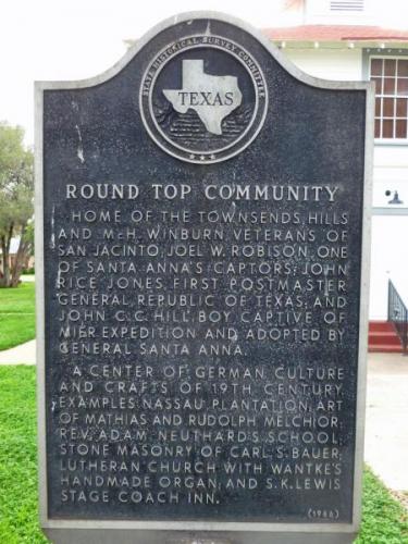 As a part of the Stephen F. Austin colony, James Winn acquired 4,428 acres (17.9 km2; 6.9 sq mi) in 1831; the present townsite was included in this tract. The community was originally known as "Townsend," after early settler Nathaniel Townsend (whose original house still exists as the Texana Lodge). Later the town was renamed "Round Top", since the postmaster lived in a house with a round tower.[4] Portions of Nassau Plantation were purchased by the Adelsverein, and settlement by German immigrants began 1845 to 1847; these settlers began buying up the local farms and the town lots.